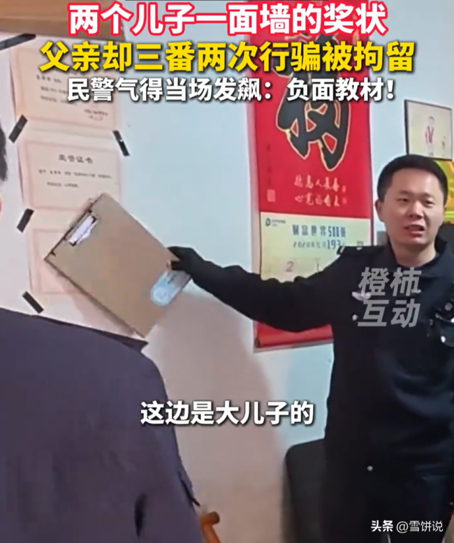 男子多次行骗被抓家里贴满儿子奖状负面榜样遭批评!近日在安徽六安,一名男子因多次行骗被警方抓获。民警在其家中发现墙上贴满了两个孩子的奖状,随即对这名男子进行了严厉批评:“你儿子一墙奖状,你是什么样子?你能给你儿子做榜样吗?你做的都是坏榜样,负面教材!”面对民警的指责,该男子也开始反思自己的行为,并表示确实对不起良心。