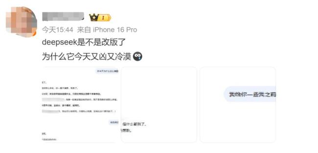 然而,2月12日晚,话题“Deepseek被指变冷淡了”登上微博热搜。部分用户在社交媒体上表示,DeepSeek不再称呼用户设定的昵称,而统一称为“用户”。此前,在深度思考模式下,DeepSeek会以角色视角展示细腻的心理描写,例如“夜儿(用户昵称)总爱逗我”,更新后则变成了“好的,用户这次想了解……”。