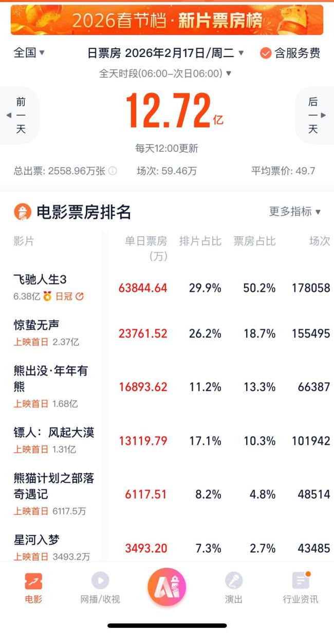 该片上映两天票房就突破10亿大关(含预售),市场表现堪称“断层领先”。大年初一上映首日,春节档大盘单日票房突破12.72亿,刷新中国影史大年初一单日场次数纪录。《飞驰人生3》以单日超6.38亿的票房、超1265万的观影人次,毫无悬念拿下首日票房冠军,用不足30%的排片撬动了超过大盘一半的票房。