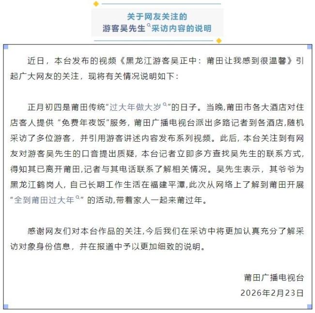 2月23日,莆田广播电视台对此发布了情况说明。正月初四是莆田传统“过大年做大岁”的日子,当晚,电视台派出多路记者到各酒店随机采访了多位游客,并引用了吴先生的讲述内容发布相关视频。