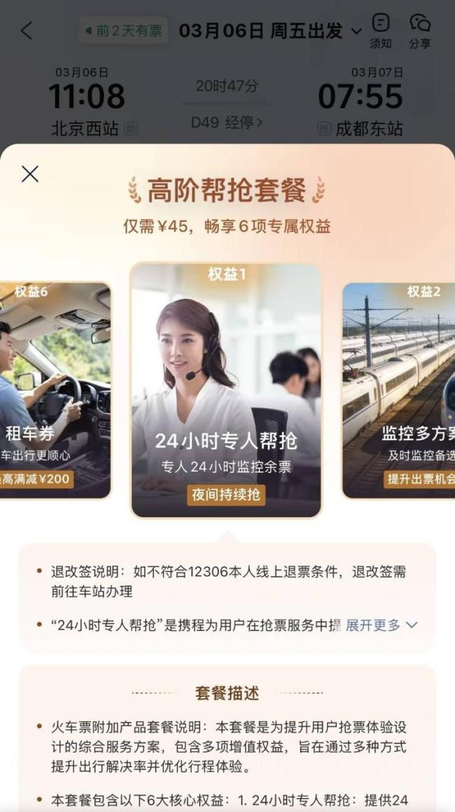 回访发现,各平台推出价值不等的付费抢票服务,大多宣传提供“人工余票监控服务”,即24小时专人帮抢、实现不间断刷票。携程客服表示,购买付费抢票加速包比在12306正常候补的购票几率要更大,不同价位套餐的核心差异是“平台内部抢票排位优先级”。当记者追问“是否与12306有合作”时,该客服坦言曾问过12306客服说没有合作。去哪儿客服承认有候补和抢票双渠道,并表示付费产品能提升余票监控等级。飞猪客服称平台抢票是“双通道飞猪捡漏”和12306候补,表示购买付费加速包后能争取在票源紧张时更快锁定车票提升刷新频率。美团客服表示,“双通道抢票概率更大一点”。