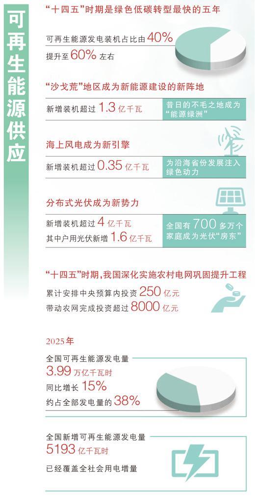 能源体系的稳定是发展的坚实根基。各行各业向高端化、智能化、绿色化深度转型离不开电力支撑。全球最大的可再生能源体系将更多“风吹、日晒、水流”转化为绿色电力,充足的能源供应和储备重塑产业生态与竞争力,成为经济社会高质量发展的稳定器和助推器。