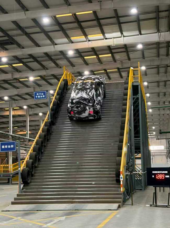 比亚迪宣布将于2026年3月5日举行技术发布会,届时将发布2026款仰望U7、U8、U8L。最近,一段神秘车辆测试的路透视频流出,视频中一辆覆盖伪装膜的车型在模拟“天门山千级台阶”的测试场地完成爬坡。场地标识显示台阶高度约15-20厘米,进深约25-30厘米,坡度超过35度。视频中标注这是第1289次测试,该车型爬坡过程表现平稳。