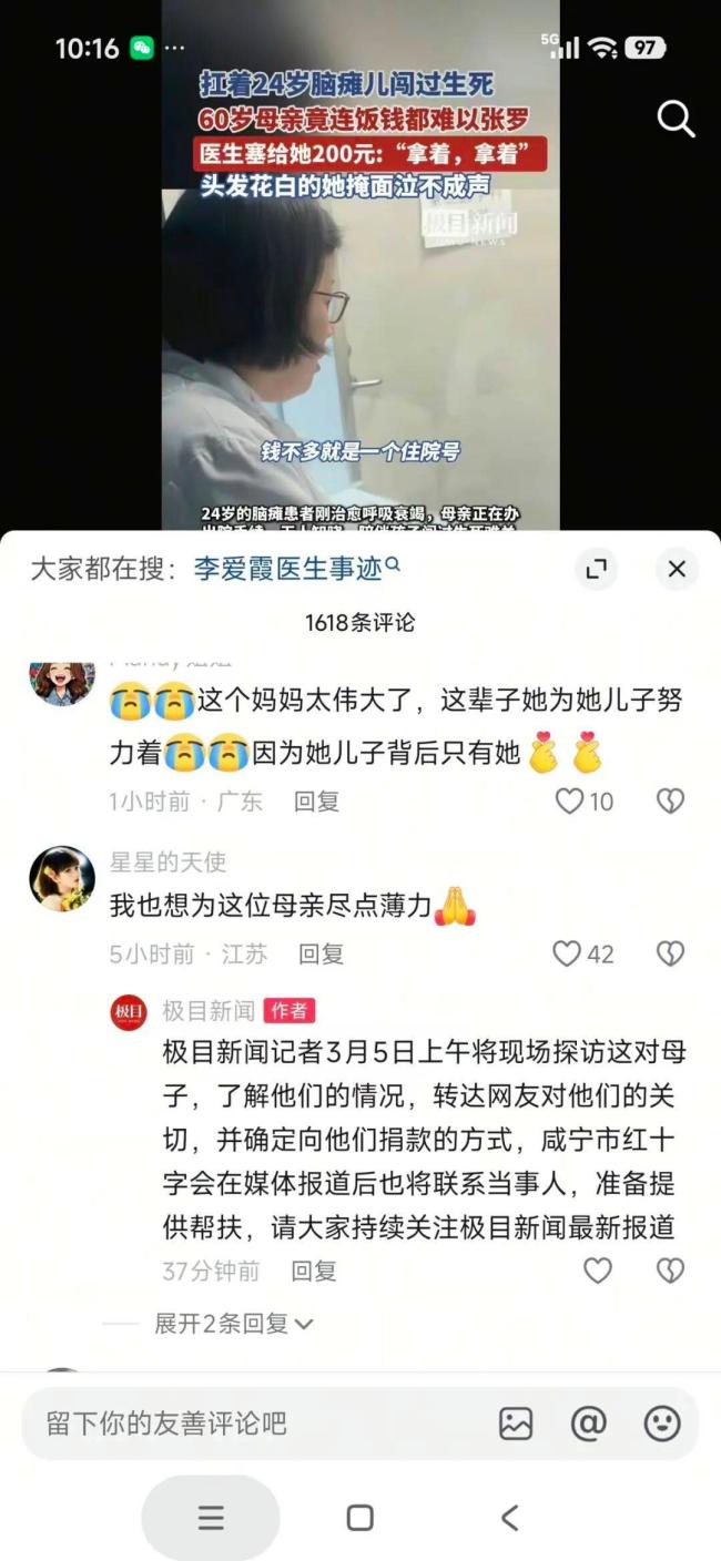 3月4日下午,媒体发布短视频还原女医生向白发母亲强塞200元爱心款的一幕,引发全网关注。许多网友点赞李爱霞医生的善举,并表达了对这位母亲境遇的关切,不少网友表示想给这对母子捐款。