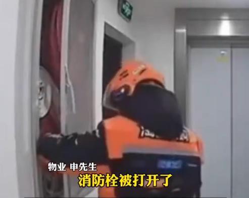 小区物业工作人员接到业主反馈有漏水情况,保安到场后发现楼道积水且消防栓被打开。通过查看一户业主家的可视门铃记录,确认是一名外卖员打开了消防栓后随即离开。经核实,该户业主与外卖员并无矛盾,门岗也未对外卖员进行阻拦。