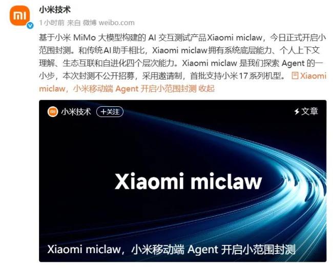 3月6日,小米发布了移动端Agent产品「Xiaomi miclaw」。基于小米MiMo大模型构建的AI交互测试产品Xiaomi miclaw正式开启小范围封测。与传统AI助手相比,Xiaomi miclaw具备系统底层能力、个人上下文理解、生态互联和自进化四个层次的能力。本次封测不公开招募,采用邀请制,首批支持小米17系列机型。