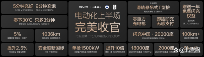 3月5日,比亚迪在深圳大运中心体育馆召开“闪充中国 改变世界”发布会,正式推出第二代刀片电池及闪充技术。该技术创造了全球量产最快充电速度的新纪录:从10%到70%只需5分钟,从10%到97%只需9分钟;在零下30度的低温环境下,从20%到97%也仅比常温多3分钟。这一突破解决了电动化上半场“充电慢”和“低温充电难”的难题。