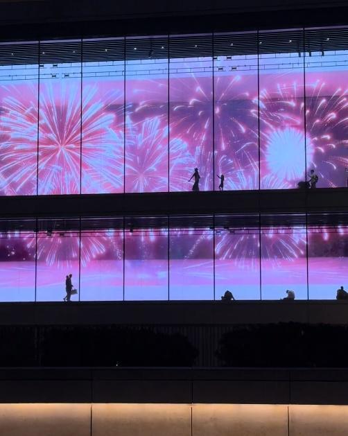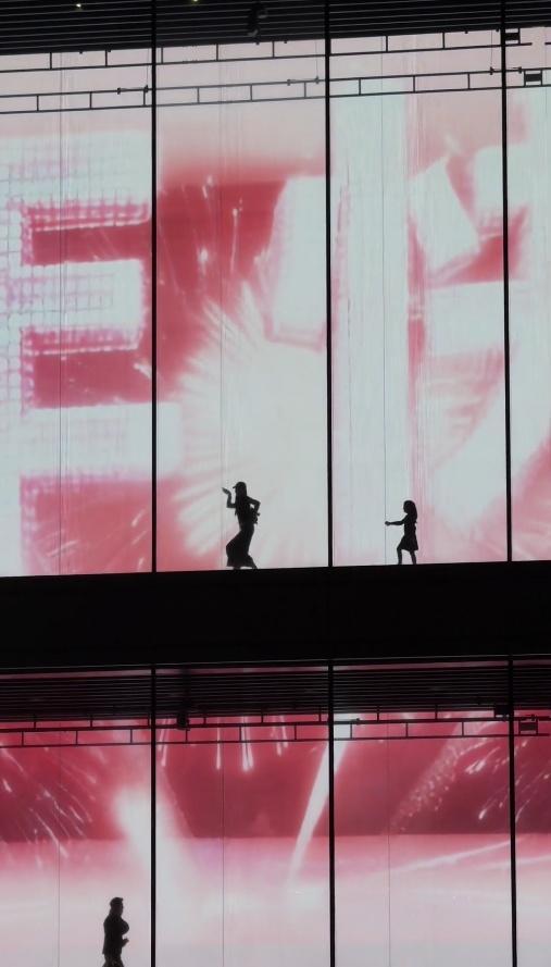 视频中,浦东美术馆内的巨型屏幕正播放新春马年主题的光影秀,璀璨的烟花在屏幕上绽放。一位妈妈情不自禁地在屏幕前起舞,身后的女儿见状也欢快地模仿起妈妈的舞步。两人的动作松弛而自然,跟在身后拍摄的爸爸则悠然记录着这一切。这一幕被远处一位路人拍下并上传至社交平台,迅速引发网友共鸣——“给人一种动画电影照进现实的感觉”。