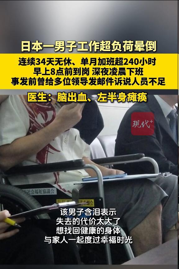 事发前,他连续工作34天无休。2025年7月19日早晨,他的妻子在家中一楼的客厅发现他倒下。紧急送医后,该男子被诊断为脑出血,并于当天接受了手术。虽然保住了性命,但他左半身瘫痪(需坐轮椅生活),伴有高级脑功能障碍(语言障碍等)以及感觉过敏(对光、声音、气味异常敏感,持续伴有头痛和恶心)。