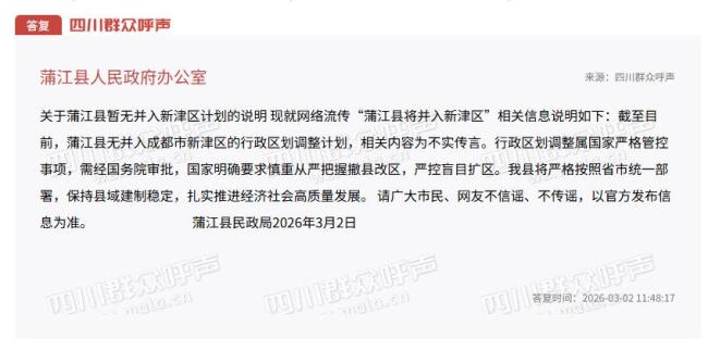 3月2日,蒲江县人民政府办公室回复网友咨询时明确表示,截至目前,蒲江县没有并入成都市新津区的行政区划调整计划,相关内容为不实传言。行政区划调整是国家严格管控事项,需要经过国务院审批。国家明确要求慎重从严把握撤县改区,严控盲目扩区。
