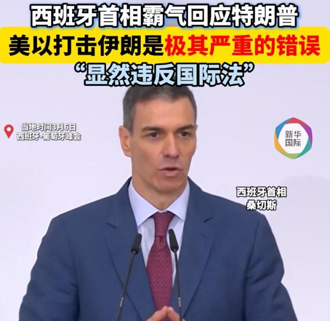 在西班牙-葡萄牙峰会期间的新闻发布会上,针对美国总统特朗普批评西班牙作为盟国拒绝支持其打击伊朗行动,桑切斯回应称,西班牙始终遵循国际法行事。他指出,盟国之间应当相互指正错误,而这场战争就是一个极其严重的错误。