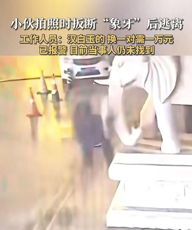 3月8日,河北沧州一家酒店曝光了一段监控视频。视频显示,一伙人来到酒店门口的大象雕塑前,其中一名男子冲过去请周围的人帮忙拍照。在拍照过程中,这名男子用力掰断了象牙。看到东西坏了后,他没有主动联系酒店赔礼道歉,反而跑了。