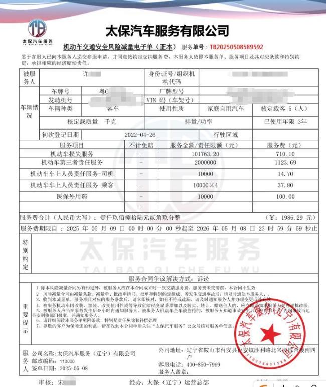 实际上,许先生2023年购买的所谓“保险”是一份由河北平富汽车服务有限公司出具的《机动车安全统筹单(电子单)》,总费用4449.12元。2025年续购的“保险”则是“太保汽车服务有限公司”出具的《机动车交通安全风险减量电子单》,总金额1986.26元。合同中提到,该公司非财产保险公司,旨在提供交通风险防控服务,不适用于《保险法》及相关司法解释的规定。