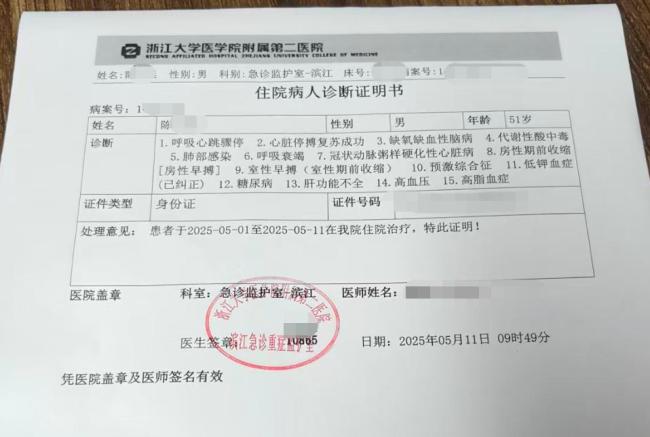 陈先生透露,父亲自2020年起在这家超市从事配送工作,2022年10月转为所谓的“全职”后,与上海庆楷实业有限公司签订了《业务合作承揽协议》。日常工作由超市门店管理,每天工作时长约为14小时。2025年4月27日,父亲向主管提出5月1日要休息一天,但遭到拒绝。5月1日当天,父亲正常上岗,在上午9点半左右突然在电梯内晕倒,手中还拿着6个待配送订单。同乘人员紧急通知物业和120,急救人员将其送往医院抢救,确诊为呼吸心跳骤停、心脏停搏复苏成功、缺氧缺血性脑病等多处病症。