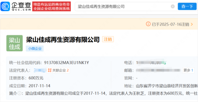 知名母婴品牌残次料被翻新售卖,涉及多家品牌。被点名的梁山希希纸制品有限公司仍在业,而其关联公司梁山佳成再生资源公司已于2025年7月16日注销。