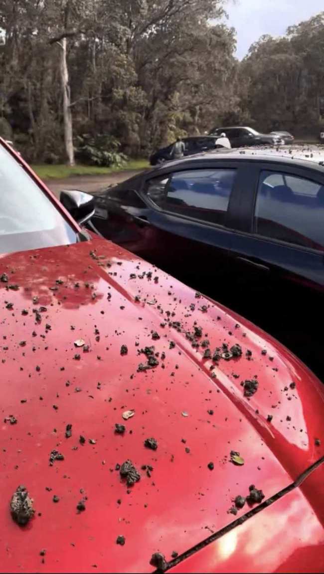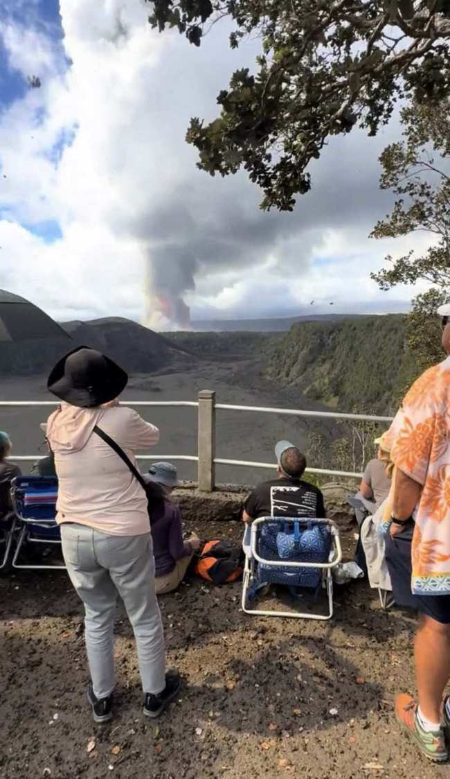 一位网友在4月6日上午11时许发布视频,描述了夏威夷大岛火山爆发的情景。视频中显示,不远处的火山喷发出很高的红色熔岩并伴随着烟雾,天空中下着“石头雨”,大小不一,大的有数厘米长,打在车身上噼里啪啦响。游客们有的打着雨伞,有的戴着帽子,也有人光着头顶,坐在护栏边的椅子上观看。