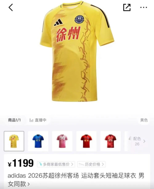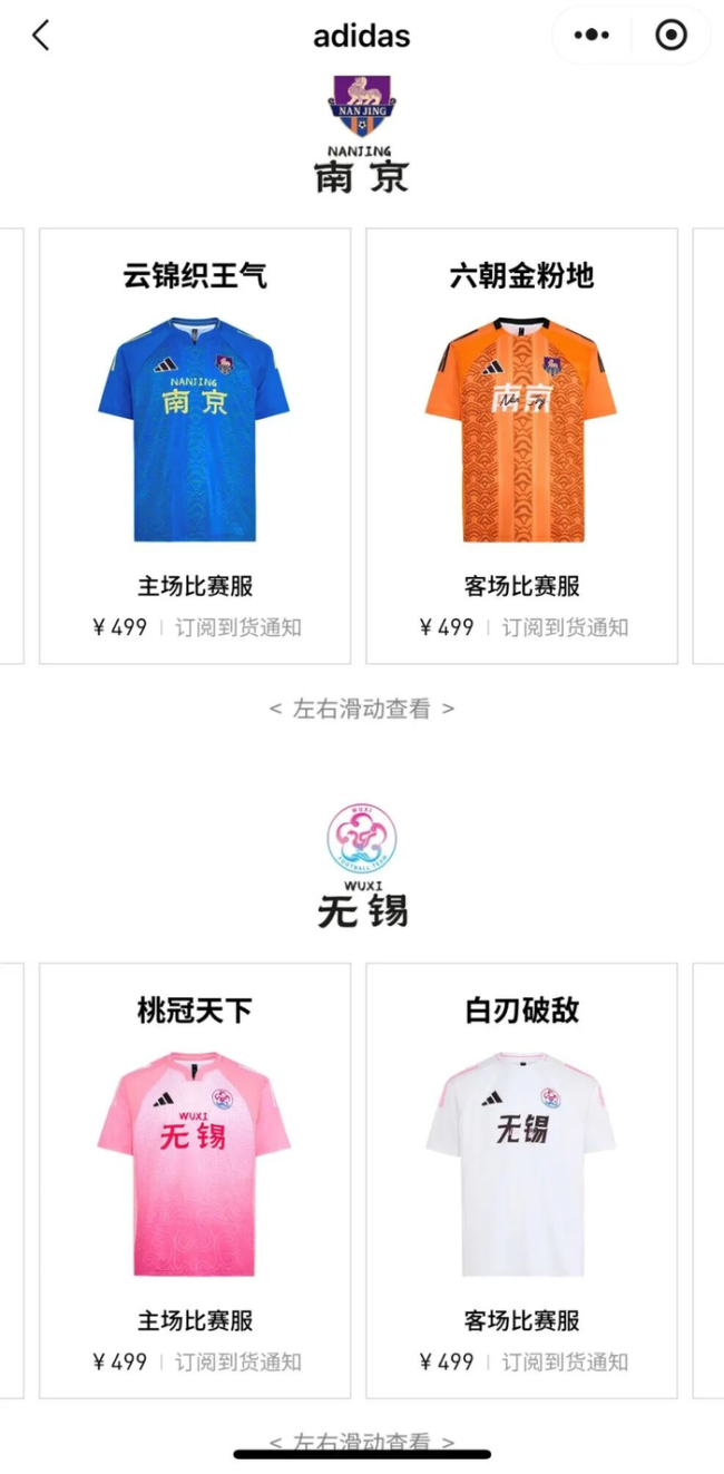 这些球衣在阿迪达斯官方小程序上架后引发了抢购热潮。售价499元的“苏超”13支球队的主客场球衣以及199元的球迷助威围巾均被抢购一空,所有商品均显示“订阅到货通知”。此外,在多个网购平台上,多款“苏超”球衣的价格已被炒至千元。