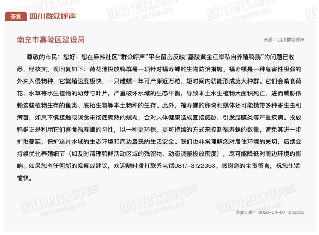 回应中解释了福寿螺的危害:福寿螺繁殖速度极快,一只雌螺一年可产卵近万粒,它们会啃食荷花、水草,破坏水域生态平衡,同时携带大量寄生虫,对人类健康构成威胁。公园投放鸭群正是利用其喜食福寿螺的习性,以更环保、可持续的方式控制福寿螺数量,保护水域生态环境。嘉陵区建设局还表示,后续会持续优化养殖细节,如及时清理鸭群活动区域的残留物、动态调整投放密度,尽可能降低对周边环境的影响。