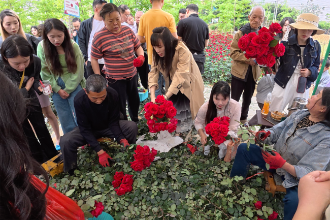 这片玫瑰田拍照免费,玫瑰花仅1元/枝即可采摘,消息迅速刷屏社交平台。周末,大批市民游客慕名前往,让大爷措手不及。现场花田里人头攒动,粉色、红色的玫瑰在春日暖阳下盛放,与游人的笑脸相映成趣。大爷手持剪刀忙得不可开交,动作麻利得几乎“抡出火星子”,连提问都无暇回应。