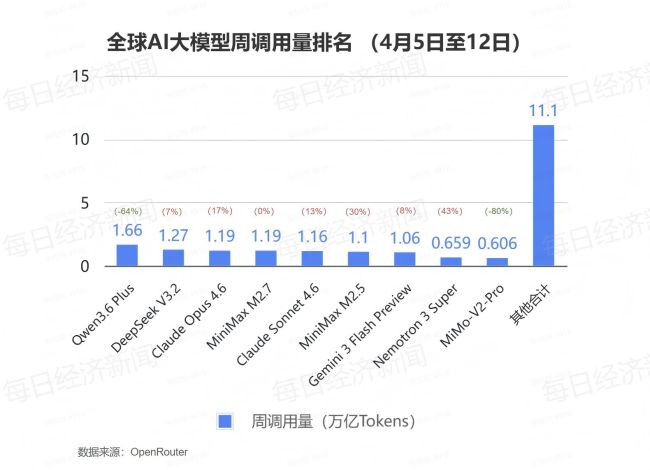 上周,全球调用量排名前五中,有三款中国AI大模型。阿里Qwen3.6 Plus位居榜首,周调用量达1.66万亿Token,环比下滑64%;DeepSeek V3.2排名第二,周调用量达1.27万亿Token;MiniMax M2.7排名第四,周调用量达1.19万亿Token。小米MiMo-V2-Pro险些跌出榜单,排名第九,周调用量达0.606万亿Token,环比下滑80.3%;阶跃星辰Step 3.5 Flash则跌出榜单。此前一周排名第八的Claude Opus 4.6冲进榜单前三,周调用量达1.19万亿Token。英伟达Nemotron 3 Super登上榜单,排名第八,周调用量达0.659万亿Token,环比增长43%。