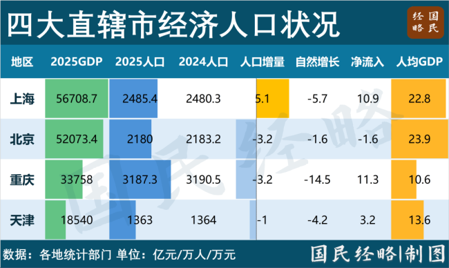 成渝“双城记”中,人口也在分化。四大直辖市中,上海保持正增长,重庆减少3.2万人,连续三年负增长。2022年至2025年间,重庆常住人口从3213万减少到3187万,总体减少了26万人。同一时期,成都增加了26.7万人。事实上,重庆全市人口收缩,但中心城区人口仍在增长。重庆拥有37个区县,面积超过8万平方公里,远超正常城市的范畴。重庆规划了主城都市区,包括21个区县,主城GDP为2.65万亿,常住人口2183万人,与成都基本处于同一水平。尽管重庆总人口在收缩,但主要是出生率下滑所致,外来人口仍保持净流入态势。