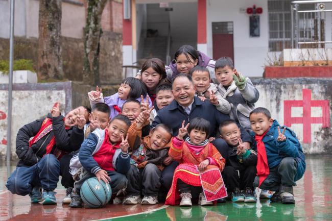 农加贵和学生们在落松地小学操场上合影。新华社记者彭奕凯摄