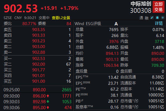 4月23日,全球光模块行业龙头中际旭创开盘后股价迅速上涨,突破900元,盘中市值超过万亿,创下历史新高。Wind数据显示,自2025年4月23日以来,中际旭创股价涨幅超过1017%。