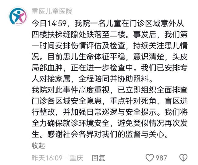 重庆医科大学附属儿童医院官方账号“重医儿童医院”在22日16时09分回复称,当天14时59分,该院一名儿童在门诊区域意外从四楼扶梯缝隙处跌落至二楼。事发后,医院第一时间进行了伤情评估及检查,并持续关注患儿情况。目前患儿生命体征平稳,意识清楚,头皮局部血肿,正在进一步检查中。医院已安排专人对接家属,全程陪同并协助照料。