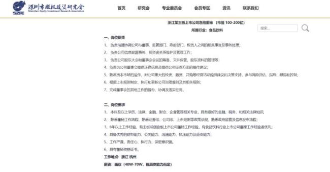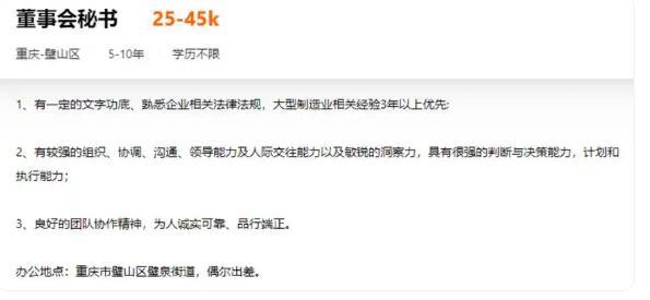 从“兼职配角”到“专职金领”,上市公司董秘的角色发生剧变。浙江某主板上市公司急招董秘,工作地点在杭州,薪酬面议(40万至70万元,视具体能力而定)。与此同时,重庆市的一家食品上市公司也在不限学历招聘董秘,月薪25K至45K,年薪约30万至54万元,办公地点位于璧山区璧泉街道。招聘信息显示,该公司与“泡椒鸡爪第一股”有友食品较为吻合。