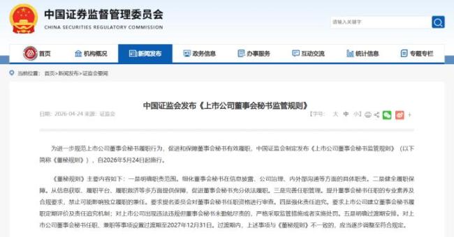 一夜之间数千上市公司董秘岗位空缺 新规引发“换血”潮。2026年4月24日,中国证监会发布《上市公司董事会秘书监管规则》,这一新规在A股市场引起广泛关注。新规明确禁止董秘兼任经理、分管经营业务的副经理或财务负责人,直接触动了近千家上市公司的神经。目前已有超过1200名在职董秘面临岗位调整,一场大规模的董秘“换血”潮正在资本市场悄然上演。