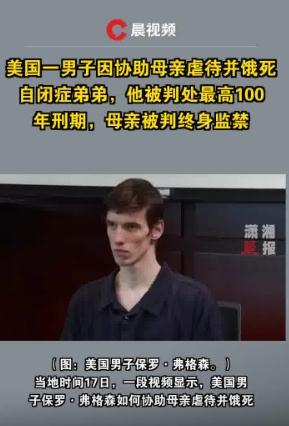 【男子帮母亲虐待饿死弟弟判百年】近日,美国一男子因协助母亲虐待并饿死自闭症弟弟,被判处最高100年刑期,母亲被判终身监禁。(来源:潇湘晨报)