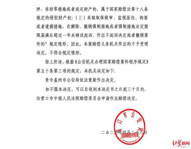 营口市公安局认为,本案中,赔偿义务机关至今未作出刑事诉讼程序终结的法律文书,且符合《最高人民法院、最高人民检察院关于办理刑事赔偿案件适用法律若干问题的解释》第三条的相关规定情形。最终,营口市公安局决定责令盖州市公安局依法重新作出决定。