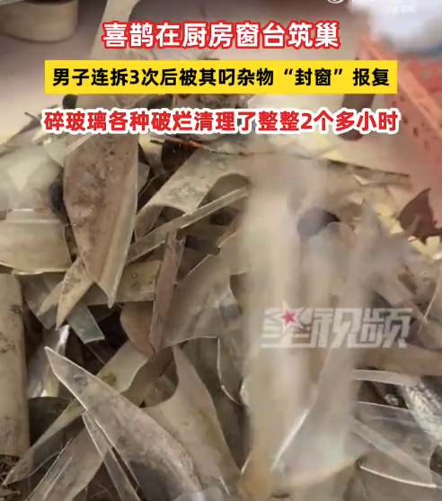 4月28日,山东一男子发视频吐槽,说自己被喜鹊给狠狠报复了。早前喜鹊在他家厨房窗台上搭窝,被他连着拆了三次。结果这下可好,喜鹊记仇了,专门跑来报复!叼来碎玻璃、泥、各种金属破烂还有树枝,硬生生把他家厨房窗户给堵得“严严实实”。男子足足收拾了两个多小时才清理干净,看着满地的垃圾,真是哭笑不得。他表示:万万没想到喜鹊这么记仇,简直成精了,脾气还挺倔!